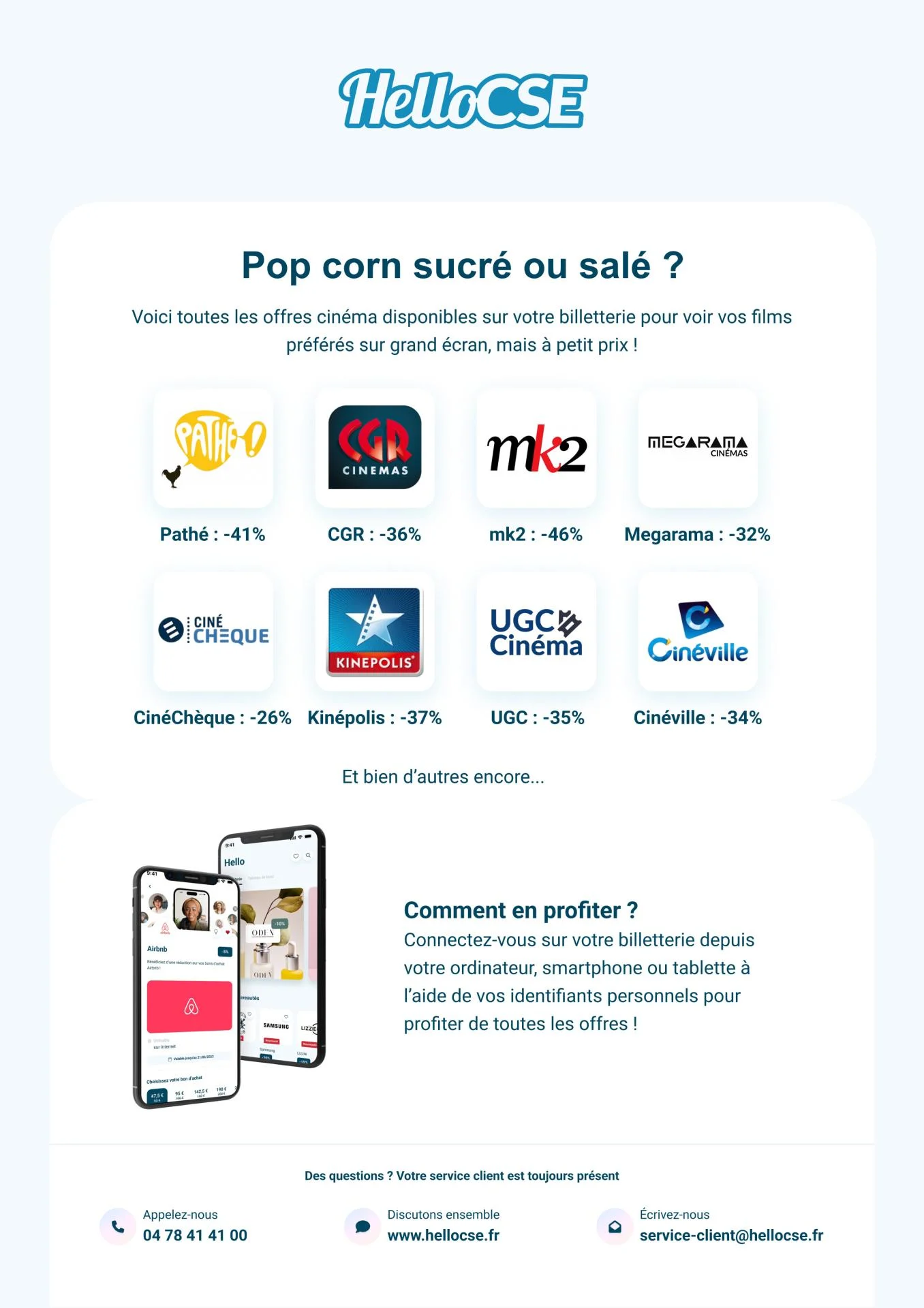 Une sortie au cinéma en famille ou entre amis ? Les enseignes partenaires HelloCSE sont nombreuses : profitez-en faites-vous plaisir ! Offres réservées aux adhérents. Contactez l'association.